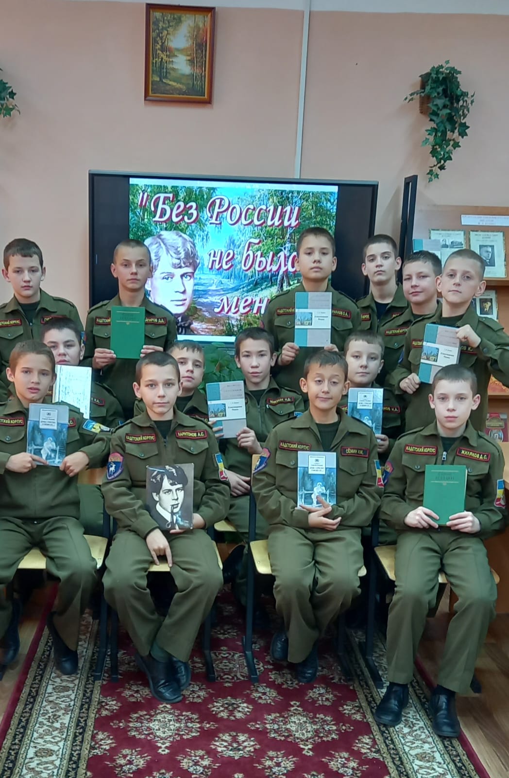 В читальном зале Университетского казачьего кадетского корпуса проведен поэтический час «Без России не было б меня», посвященный творчеству великого поэта Сергея Александровича Есенина, который прошел в рамках Всероссийской Есенинской недели. Библиотекарь Кичкинева С.Ц. рассказала читателям о жизни и творчестве поэта, о главных темах его поэзии: теме родной природы, дружбы, любви. Прозвучали такие стихи, как «Письмо матери», «Русь», «Закружилась листва золотая». Участники мероприятия не только читали стихи Есенина, но и слушали их в исполнении автора в записи.