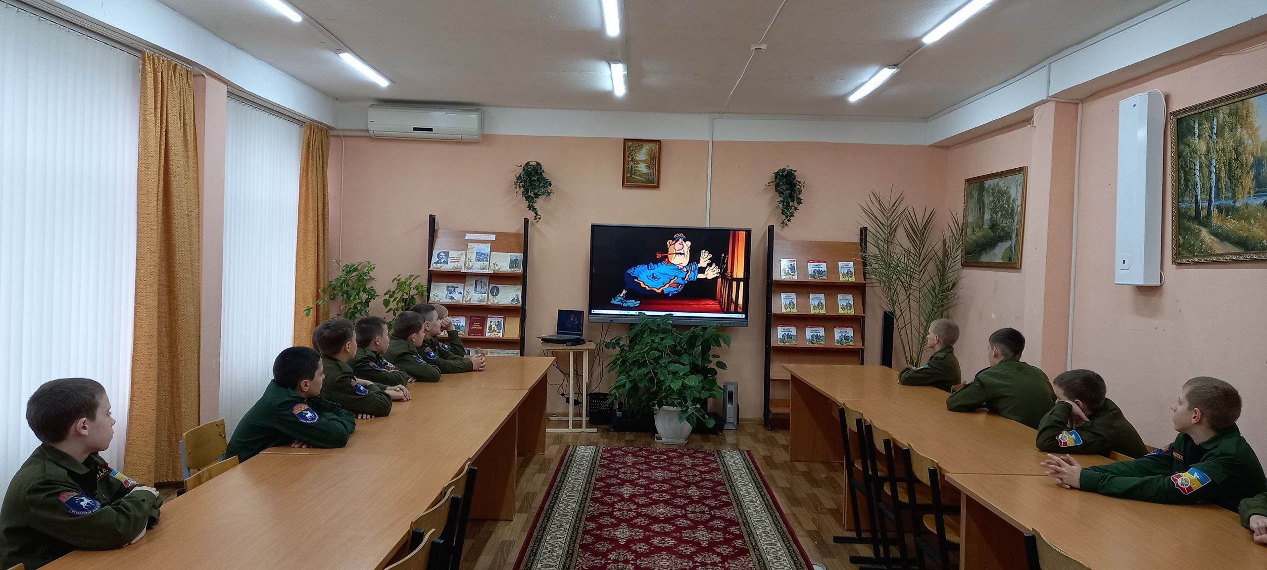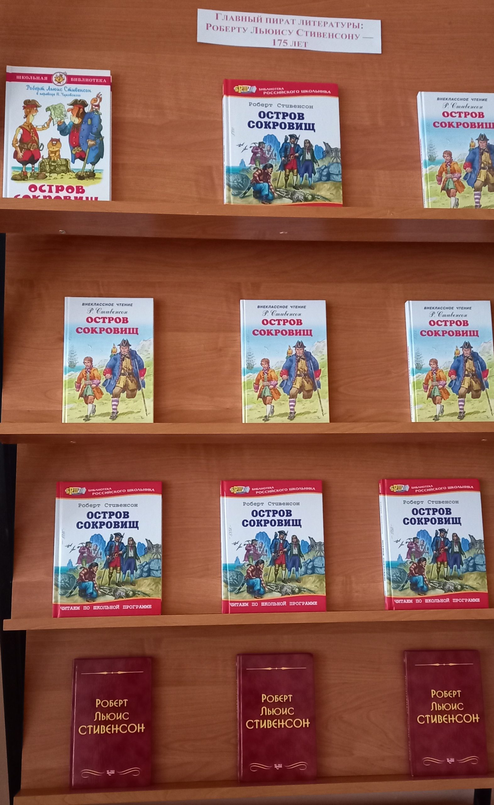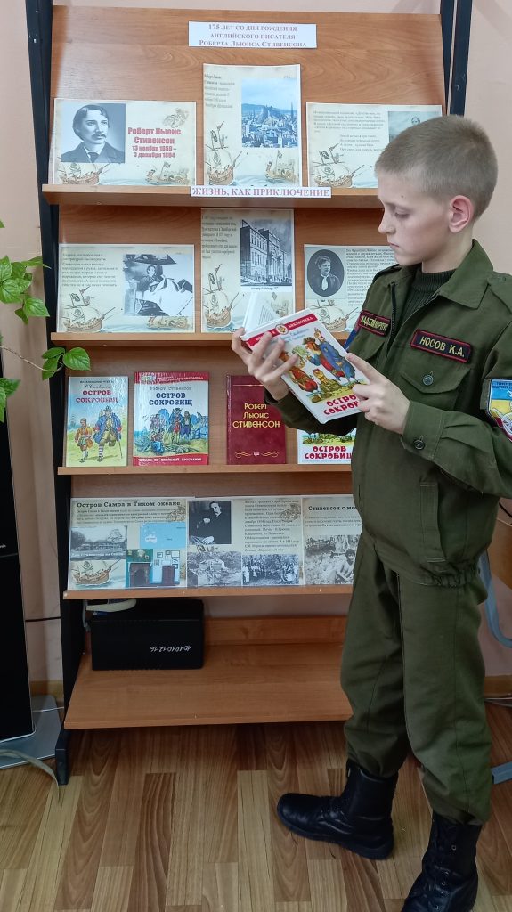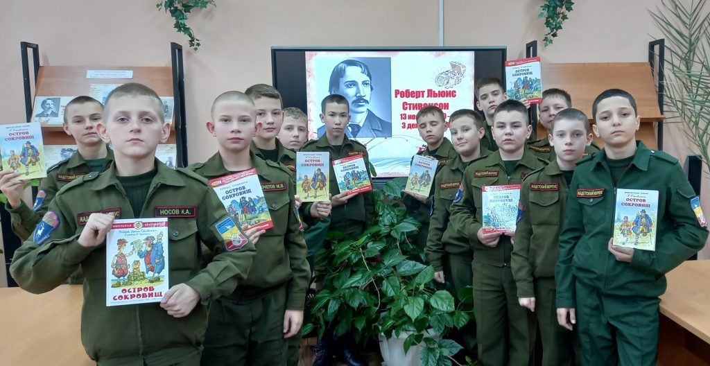 Ведущий библиотекарь Кичкинева С.Ц. познакомила кадет с творчеством выдающегося британского писателя, поэта и драматурга, чьи произведения стали неотъемлемой частью мировой культуры. Библиотекарь рассказала об основных книгах писателя, представленных на выставке.  Отдельная часть беседы была посвящена роману «Остров сокровищ». В завершение мероприятия кадеты посмотрели фрагменты двухсерийного  полнометражного мультфильма 1988 года (режиссёр Давид Черкасский) снятому по одноимённому роману Роберта Льюиса Стивенсона «Остров сокровищ».