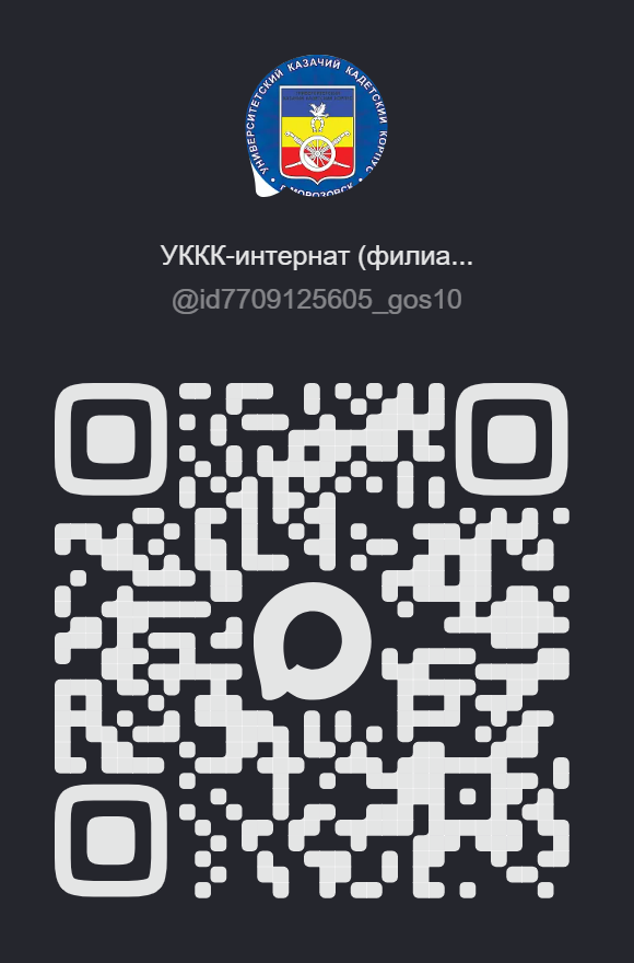 Ищите нас в приложении MAX по названию УККК-интернат (филиал) ФГБОУ ВО «МГУТУ им. К.Г.Разумовского (ПКУ)» в г. Морозовске или переходите по ссылке https://max.ru/id7709125605_gos10 или QR-коду:
