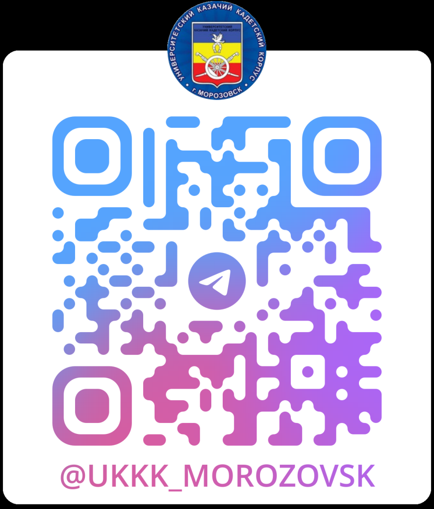 Ищите нас в приложении Telegram по названию УККК-интернат (филиал) ФГБОУ ВО «МГУТУ им. К.Г. Разумовского (ПКУ)» в г. Морозовске РО или переходите по ссылке t.me/ukkk_Morozovsk или QR-коду:
